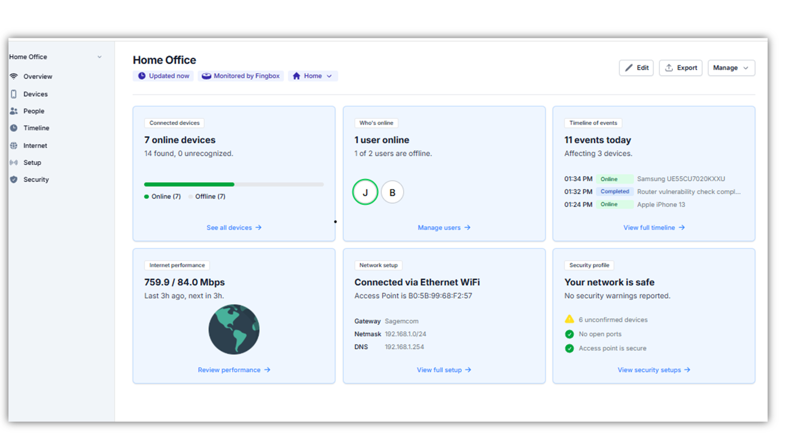 Tasks and information are categorized by the cards displayed on the dashboard--Connected Devices, Who's Online, Timeline of Events, Internet Performance, Internet Setup and Security Profile. Each card provides an at-a-glance summary of key information. Select each card to show expanded information and insights. The summaries save time so you can see easily where you need to take immediate action.