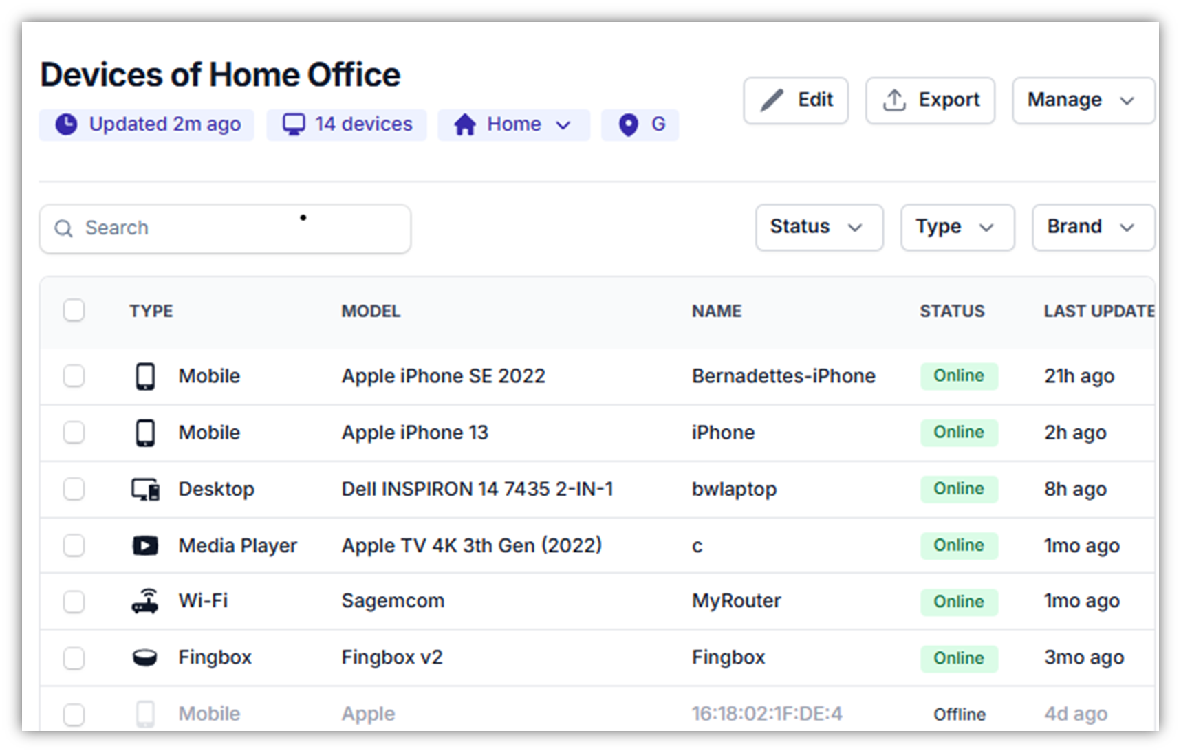 - Select See All Devices or the See All Devices Card on Fing Web App to see detailed information on your devices and get a full inventory of your devices.