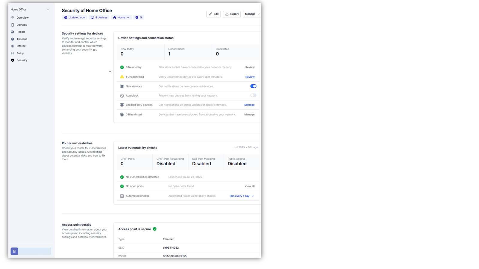 It provides at-a-glance insights into key security measures including new or unrecognized devices, router and port vulnerabilities, and any access point security weaknesses. You can also manage security alerts, for example, to receive notifications of uncrecognized devices, or to receive alerts on specific devices. See Assess Network Security (Fing Web App) for details.