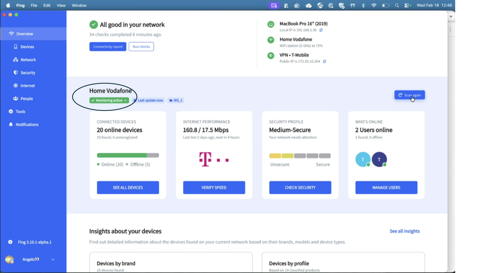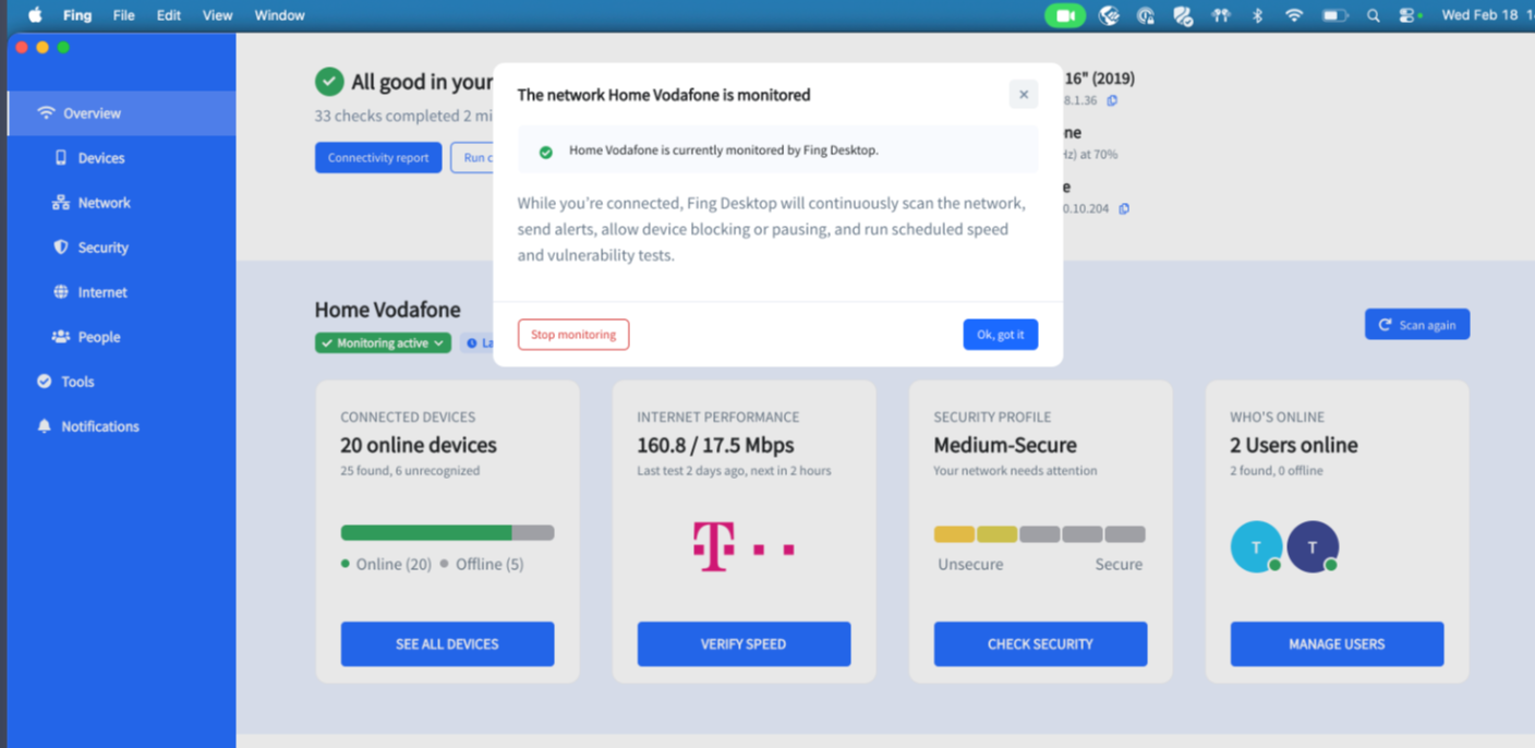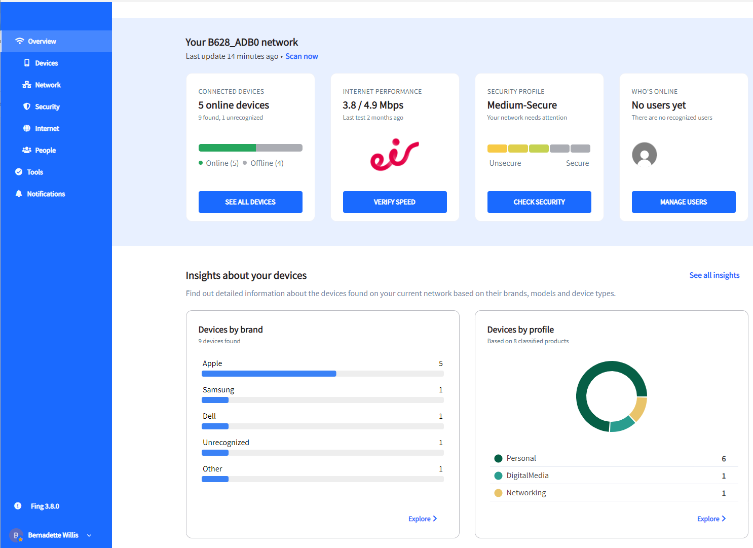 Similar to Fing Web App, the dashboard is displayed when you launch Fing. In the example using the Fing desktop app, you can see at once that the general health of the network is good but the security level could be better. You can also see that Digiweb is the network provider with an upload speed of 77.6 Mbps and a download speed of 72.7 Mpbs.
