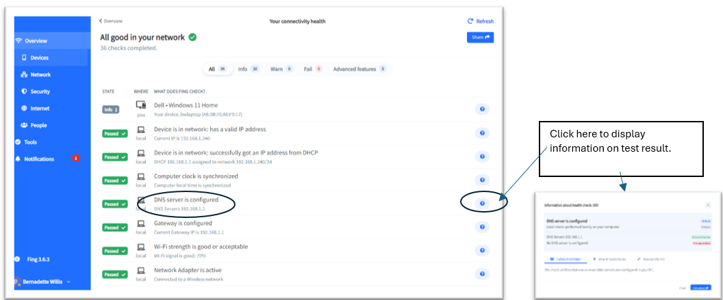 The Connectivity Report provides a detailed connectivity status in real time for your network, for example, DNS, DHCP, and Gateway information, whether it can access common destinations, as well as whether it passed or failed tests for good connectivity. Go to Connectivity Report for more information on this report.