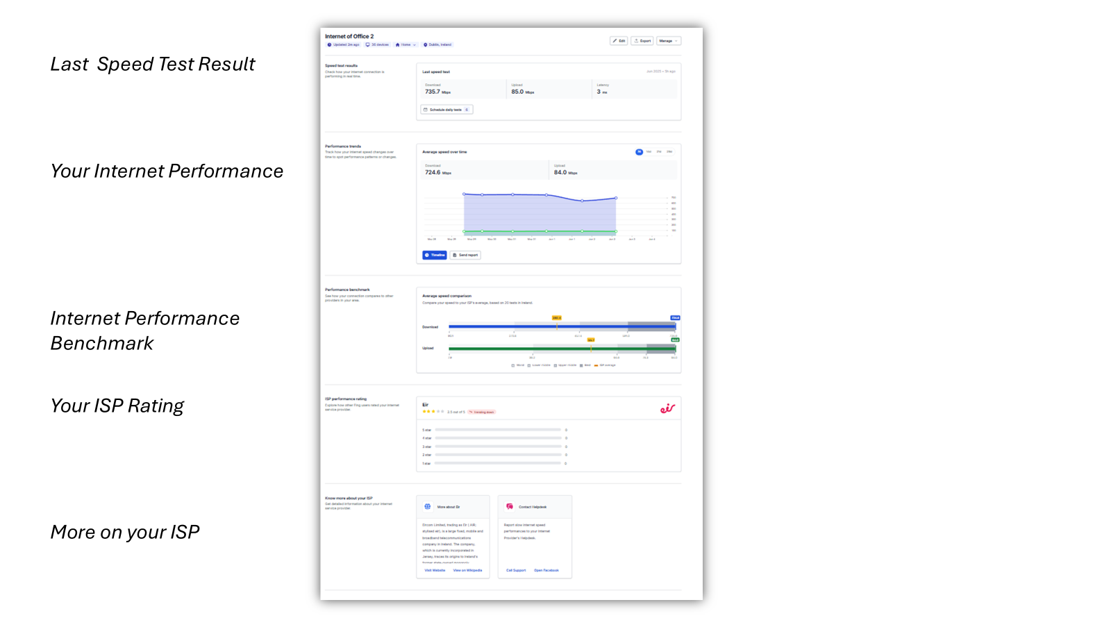 Use the Internet Performance card to view and monitor your Internet performance and how it compares to average ISP performance in your area. You can easily see if your internet is slower or faster than other IPSs. You can see your current internet speed, your ISP provider, and average speed over a specified number of days. You can view the results of the latest speed test performed (Fing Web App).